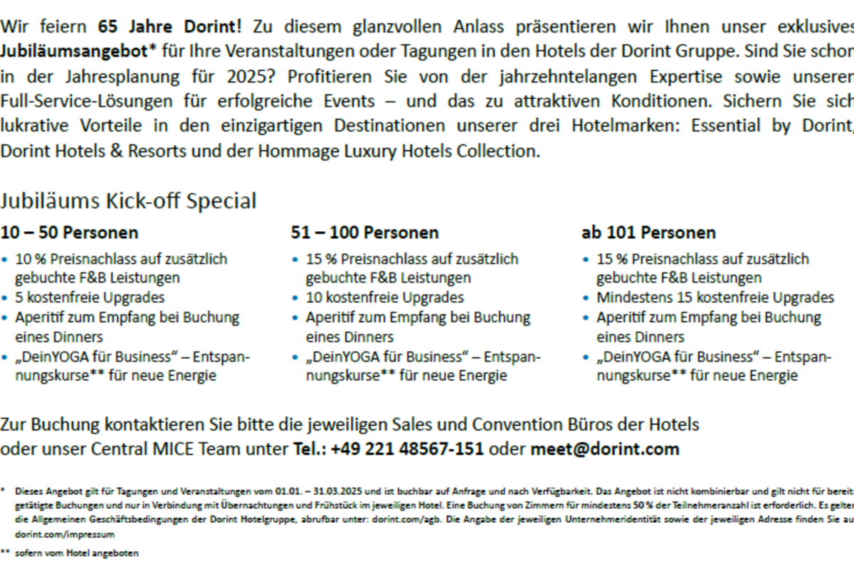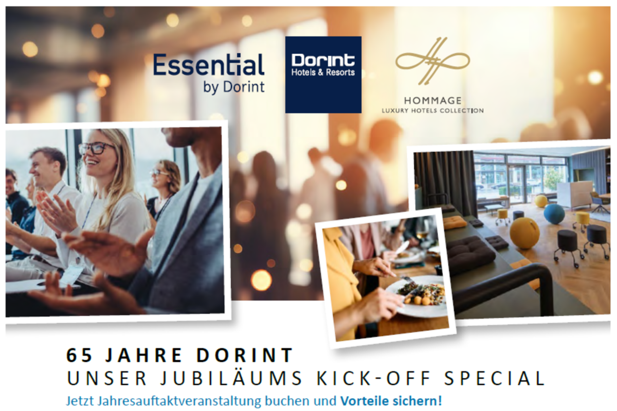 Wir feiern 65 Jahre Dorint! Zu diesem glanzvollen Anlass präsentieren wir Ihnen unser exklusives Jubiläumsangebot* für Ihre Veranstaltungen oder Tagungen in den Hotels der Dorint Gruppe. Sind Sie schon in der Jahresplanung für 2025? Profitieren Sie von der jahrzehntelangen Expertise sowie unseren Full-Service-Lösungen für erfolgreiche Events – und das zu attraktiven Konditionen. Sichern Sie sich lukrative Vorteile in den einzigartigen Destinationen unserer drei Hotelmarken: Essential by Dorint, Dorint Hotels & Resorts und der Hommage Luxury Hotels Collection.