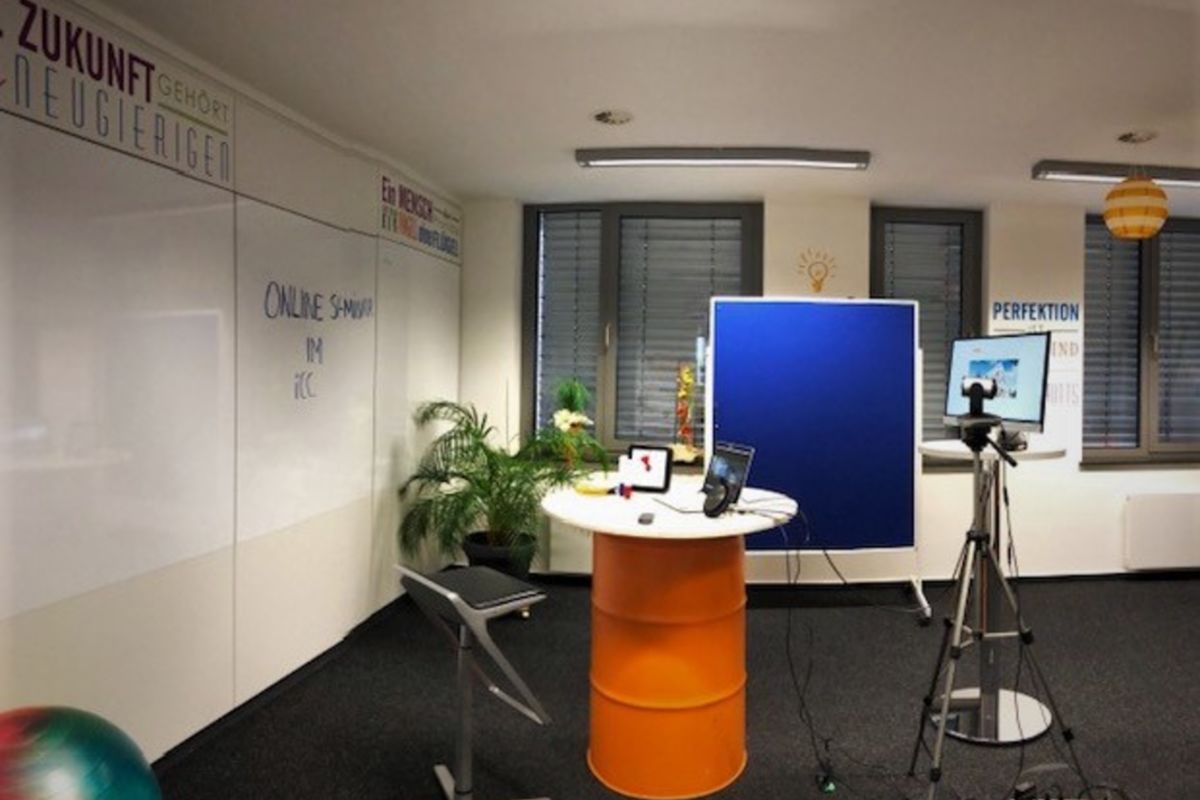 Wir haben diesen Raum für die besonderen Bedürfnisse von Webinaren gestaltet: Schallschluckende Elemente, abgestimmte Beleuchtung, beschreibbare Wände und eine angenehme Atmosphäre sind die idealen Rahmenbedingungen für erfolgreiche Zoom-Meetings und Online-Seminare. Dazu gehört eine hohe WLAN-Bandbreite und das richtige technische Equipment. Natürlich versorgen wir Sie auch mit Snacks und Getränken.