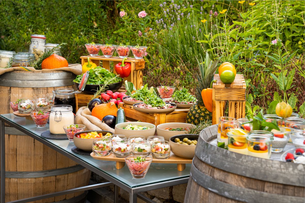 So schmeckt der Sommer: Genießen Sie vielfältige Grillbuffets im Innenhof mit frischen Salaten, saftigen Steaks, veganen Optionen und fruchtigen Desserts – ideal für Gruppen und Events. *** This is what summer tastes like: Enjoy diverse grill buffets in our courtyard with fresh salads, juicy steaks, vegan options and fruity desserts – ideal for groups and events.