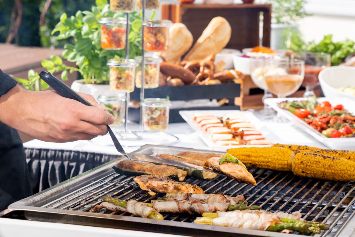 Tagung mit Ausklang auf der Sonnenterrasse: Grillbuffet mit Steak, Lachs & Veggie-Optionen, Salatvielfalt und Sommerdrink. Der perfekte Abschluss für Ihr Event in Wolfsburg. *** Conference ending on the sun terrace: barbecue buffet with steak, salmon and vegetarian options, a variety of salads and summer drinks. The perfect end to your event in Wolfsburg.