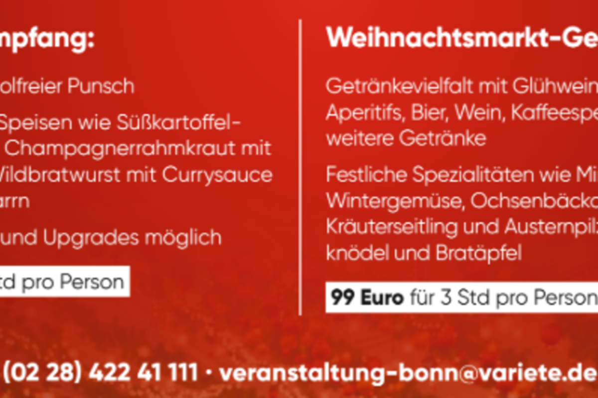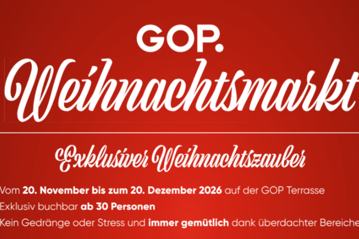 Ob festliche Weihnachtsfeier oder stimmungsvolle Firmenfeier zum Jahresausklang – schaffen Sie besondere Momente, die lange in Erinnerung bleiben. Begeistern Sie Ihr Team in weihnachtlicher Atmosphäre und feiern Sie gemeinsam ein außergewöhnliches Erlebnis auf höchstem Niveau. Vom 20. November bis zum 20. Dezember 2026 verwandelt sich die Terrasse des GOP Varieté-Theaters in einen stimmungsvollen Weihnachtsmarkt mit Lichtern, weihnachtlicher Musik, liebevoller Deko und dem unverwechselbaren Duft von Glühwein. Für Gruppen von 30 bis 100 Personen haben Sie die Wahl zwischen zwei besonderen Erlebnissen: einem festlichen Glühwein-Empfang oder dem Weihnachtsmarkt-Genusserlebnis, einer kulinarischen Reise in winterlicher Atmosphäre. Beide Angebote schaffen einen besonderen Rahmen für Ihre Firmenveranstaltungen oder Kunden-Events und überzeugen durch eine angenehme, wetterunabhängige Durchführung in überdachten Bereichen. Der festliche Glühweinempfang bietet ein stimmungsvolles kulinarisches Erlebnis. Im Angebot enthalten sind Glühwein sowie alkoholfreier Punsch. Für das leibliche Wohl sorgen unter anderem ein veganer Süßkartoffelsalat mit Ingwer, Amarettini und Gemüse-Kichererbsen-Knusper sowie ein vegetarisches Gericht aus Champagnerrahmkraut mit Schupfnudeln und Trüffelcreme. Ergänzt wird das Angebot durch Wildbratwurst mit einer Currysauce aus Aprikose und Mango, serviert mit Merzenichs Bauernbrot. Als süßer Abschluss wird Kaiserschmarrn mit Zimt und Zucker, Vanilleschaum und Apfelkompott gereicht. Der Preis beträgt 43 Euro pro Person für eine Dauer von 1,5 Stunden. Das GOP Weihnachtsmarkt-Genusserlebnis umfasst ein abwechslungsreiches und hochwertiges Arrangement in winterlicher Atmosphäre. Während eines Zeitraums von drei Stunden genießen die Gäste eine breite Auswahl an Getränken – von Glühwein und Punsch über Aperitifs, Bier und Wein bis hin zu Kaffeespezialitäten und weiteren Begleitgetränken. Kulinarisch startet das Erlebnis mit Merzenichs Brot, das mit Gänseschmalz und aromatischer Gewürzbutter serviert wird. Im Anschluss folgt eine herzhafte Minestrone aus winterlichem Gemüse, verfeinert mit Gremolata und Grana Padano. Als Hauptkomponenten stehen sowohl ein Fleischgericht mit zart geschmorten Ochsenbäckchen in einer Valrhona-Schokoladen-Jus, begleitet von Lebkuchen, Apfelrotkraut und Serviettenknödeln mit Winterfrüchten, als auch eine vegetarische Alternative in Form eines Pilzragouts aus Kräuterseitlingen und Austernpilzen mit Sauerampferpesto, Nussbutter-Crunch und Kartoffelklößen zur Auswahl. Den süßen Abschluss bilden gleich zwei winterliche Dessertvariationen: Marillenknödel mit Zimt-Zucker-Bröseln, Vanilleschaum und Himbeersauce sowie Bratäpfel, gefüllt mit Preiselbeeren, Mandeln und Marzipan, serviert mit einer feinen Eierlikörsauce. Der Preis für dieses Arrangement liegt bei 99 Euro pro Person.