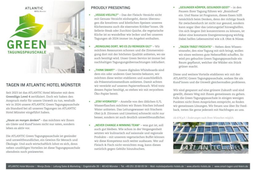 Die neuen grünen Tagungspauschalen im ATLANTIC Hotel Münster schonen nicht nur die Umwelt, sondern haben zusätzlich folgende Vorteil für Sie