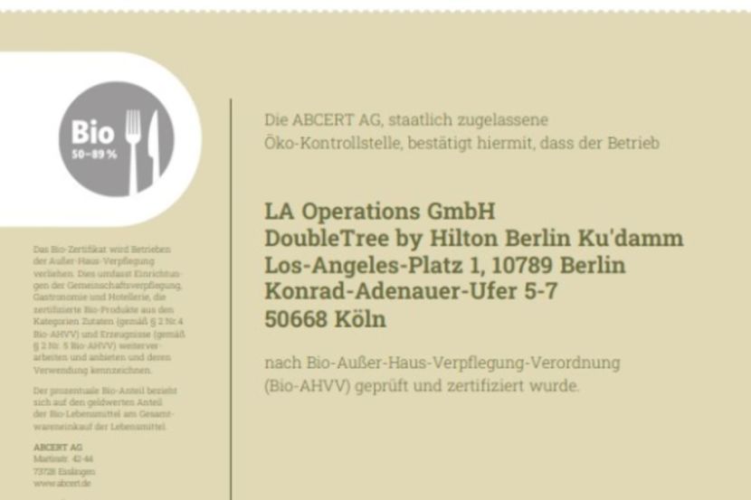 Das DoubleTree Berlin Ku'damm ist stolz auf sein Silber-Zertifikat, das einen Bio-Anteil von 50-89% bestätigt.